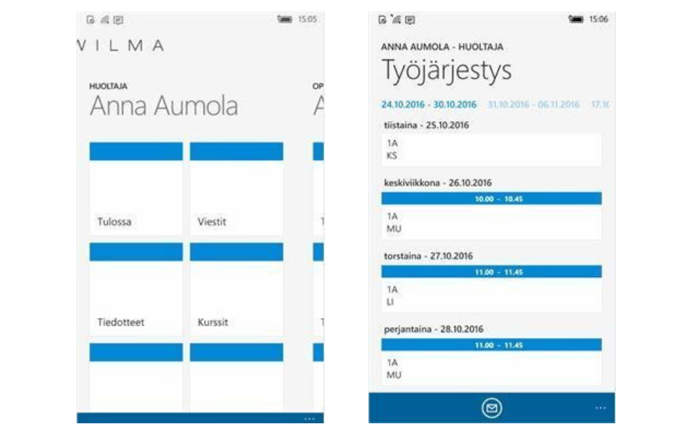 Tältä näytti ensimmäinen Wilma-sovellus, joka julkaistiin Windows-puhelimille vuonna 2013. Voit klikata kuvan isommaksi.